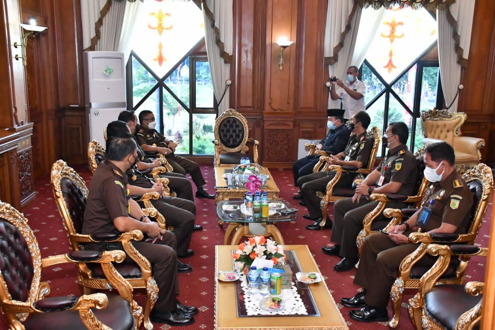Jambi – Gubernur Jambi Al Haris yang didampingi oleh Sekretaris Daerah Provinsi Jambi H.Sudirman, menyambut kunjungan kerja silahtumahmi Kepala Kejaksaaan Tinggi Jambi yang baru saja dilantik pada tanggal 29 Juli 2021 yang lalu di Ruang Kerja Gubernur Jambi, Rabu (4/8/2021).