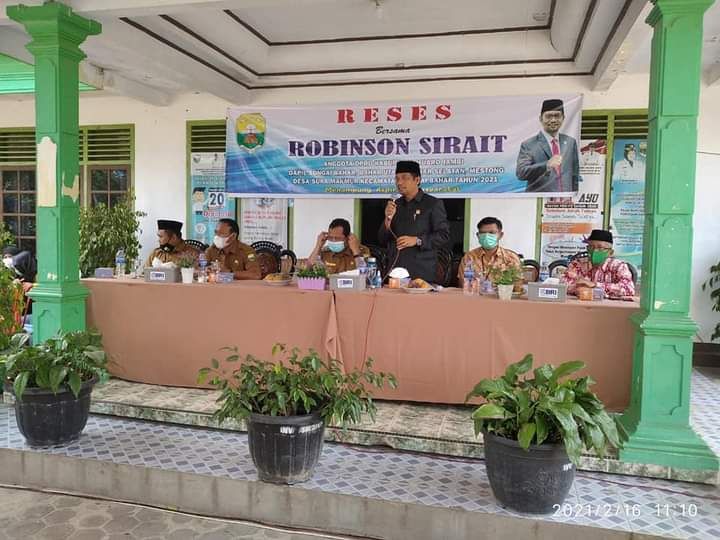 Salah satunya adalah Robinson Sirait Anggota DPRD Muarojambi dari Fraksi PAN. Dia melaksanakan kegiatan reses II di Desa Suka Makmur, Kecamtan Sungai Bahar, Daerah Pemilihan (Dapil IV) Mestong-Sungai Bahar guna menyerap aspirasi masyarakat pada Selasa (16/02/2021).