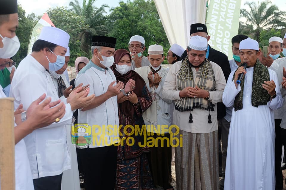 Muarojambi – Bupati Muarojambi Hj. Masnah Busyro, SE, M.Tr.IP dampingi Anggota Komisi VIII DPR RI Dapil Jambi Drs. H. Hasan Basri Agus, MM (HBA) pada acara peletakan batu pertama pembangunan Masjid Ness Daarut Tauhid.