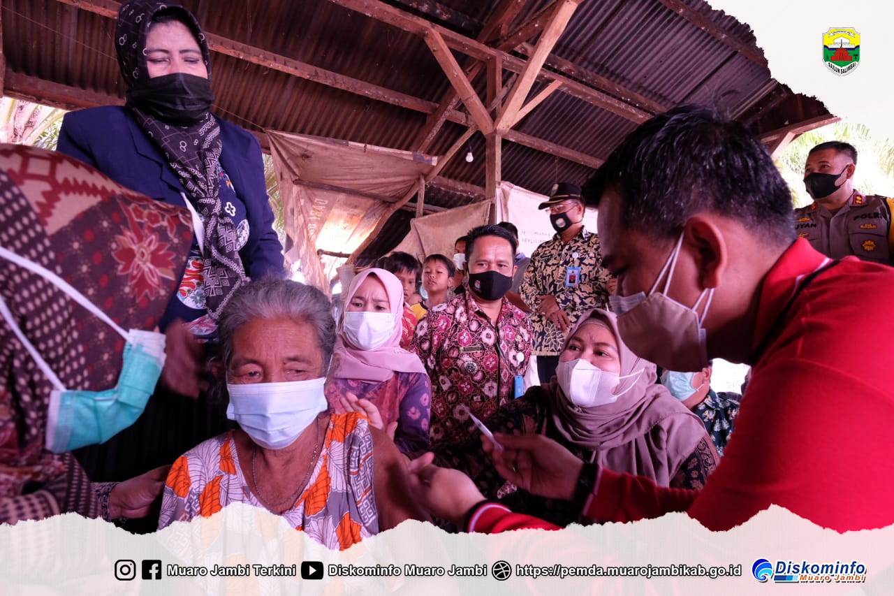 Muaro Jambi – Bupati Muaro Jambi Hj. Masnah Busro,mengunjungi rumah warga Suku Anak Dalam ( SAD) di Desa Nyogan, Kecamatan Mestong, Kabupaten Muaro Jambi pada Kamis (19/8/2021).