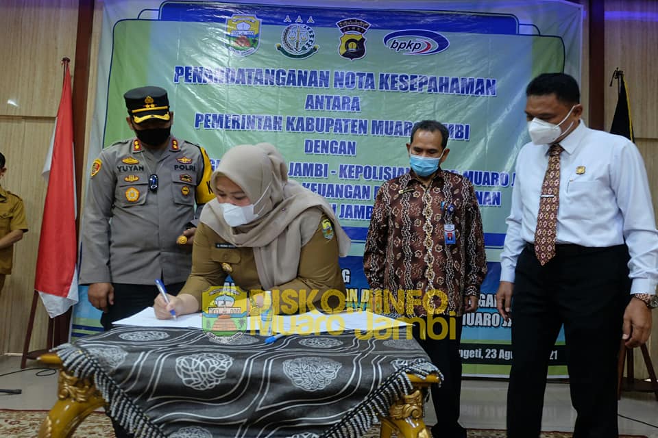 Muaro Jambi – Bupati Muaro Jambi Hj. Masnah Busyro, SE, M.Tr.IP lakukan penandatanganan nota kesepahaman antara Pemerintah Kabupaten Muaro Jambi dengan Kejaksaan Negeri Muaro Jambi, Kapolres Muaro Jambi, dan Badan Pengawasan Keuangan dan Pembangunan Provinsi Jambi.