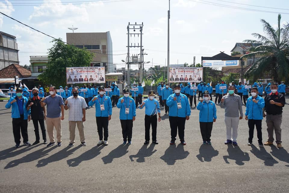 Jambi – Gubernur Jambi Dr. Al Haris S.Sos M.H., melepas 101 anggota atlet perwakilan Provinsi Jambi yang akan berlaga di Pon ke-20 di Papua. Pelepasan secara resmi dilakukan di Komplek Stadion KONI Kota Jambi Sabtu Siang (11/8). Selain para atlet Kontingen Jambi terdiri juga dari para official, para pelatih yang total keseluruhannya berjumlah 159 orang dan dikoordinasi oleh ketua KONI Jambi Budi Setiawan. Hadir juga dalam kegiatan tersebut Pelaksana Tugas Kepala Dinas Kepemudaan dan Olahraga Provinsi Jambi (Diskepora) Provinsi Jambi Ronaldi