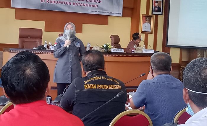 Tanpa ragu sedikit pun, Anita Yasmin menyampaikan pemikiran dihadapan puluhan Pengurus Organisasi Masyarakat, LSM dan organisasi Mahasiswa, di ruang pola kecil Kantor Bupati Batanghari.