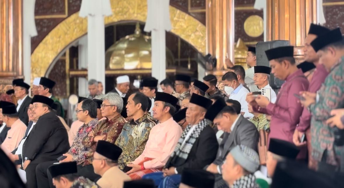 Jambi – Ketua DPRD Provinsi Jambi, Edi Purwanto bersama istri menghadiri akad nikah Esy Risdianti, putri sulung Gubernur Jambi Al Haris, Jumat (19/4). Proses akad nikah bersama dengan Muhammad Iqbal Putra berlangsung di Masjid Agung Al Falah Jambi.