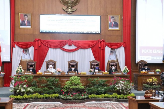 Muaro Jambi – Ketua DPRD Muarojambi Yuli Setia Bhakti memimpin langsung paripurna istimewa mendengar pidato kenegaraan presiden RI dalam rangka HUT RI ke 76.