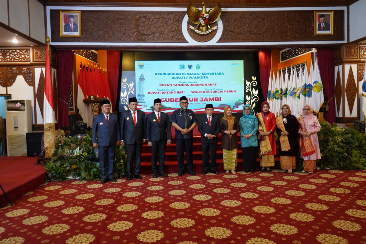 Jambi – Gubernur Jambi Dr. H. Al Haris, S. Sos, MH mengukuhkan Penjabat Sementara (Pjs), di tiga wilayah Provinsi Jambi, bertempat di Auditorium Rumah Dinas Gubernur Jambi, Selasa (24/09/2024). Para pejabat yang dilantik adalah Kepala Dinas Kesehatan Provinsi Jambi, dokter Fery Kusnadi SpOG, sebagai Pjs. Bupati Tanjung Jabung Barat, Kadissosdukcapil Provinsi Jambi Arif Budiman untuk Pjs. Bupati Batang Hari dan Staf Ahli Gubernur Jambi Bidang Kemasyarakatan Tema Wisman untuk Pjs. Wali Kota Sungai Penuh.