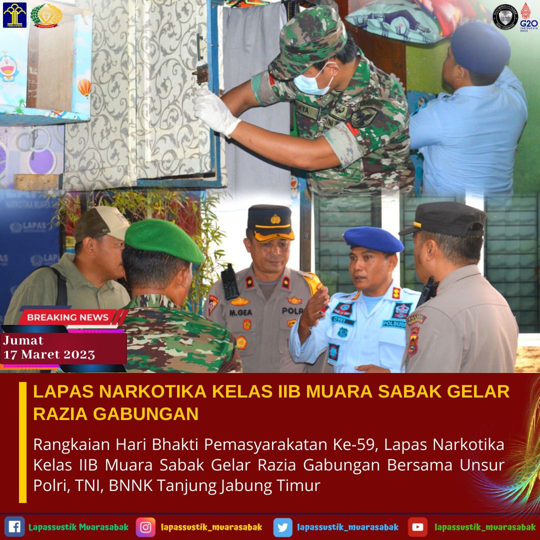 Pelaksanaan Razia Gabungan Kamar Hunian Warga Binaan ini di Pimpin langsung oleh Kalapas Narkotika Muara Sabak Dwi Hartono yang melibatkan pihak Polres Tanjung Jabung Timur, Pabung perwakilan Kodim Tanjung Jabung dan BNNK Tanjung Jabung Timur.
