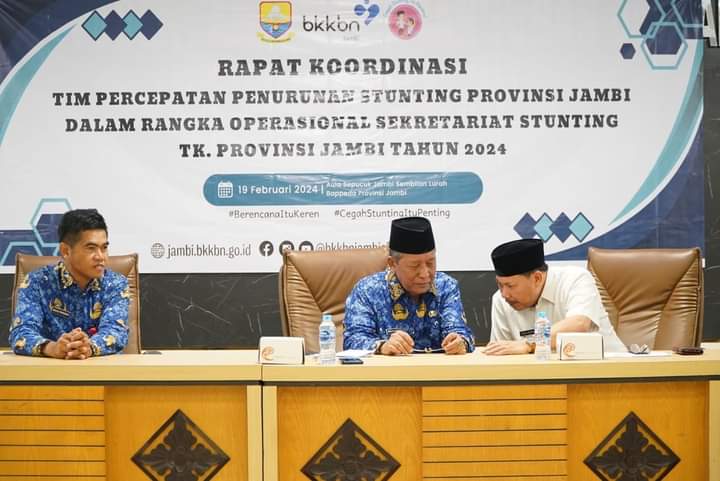 Jambi – Wakil Gubernur (Wagub) Jambi Drs. H. Abdullah Sani, M.pdi, mengemukakan, penurunan angka stunting menjadi salah satu indikator keberhasilan Pemerintah Daerah dalam pembangunan, untuk Pemerintah Provinsi (Pemprov) Jambi terus berupaya dan menargetkan penurunan stunting pada tahun 2024 sebesar 12 persen. Untuk mencapai target tersebut diperlukan upaya lebih keras lagi dalam pencegahan dan penanggulangan stunting di kabupaten/kota dan diperlukan kerja sama yang akurat dan satu data. Hal tersebut dikemukakan Wagub saat Pembukaan Rapat Koordinasi Tim Percepatan Penurunan Stunting (TPPS) Provinsi Jambi, Dalam Rangka Operasional Sekretariat Stunting Tingkat Provinsi Jambi Tahun 2024, bertempat di Aula Kantor Bapedda Provinsi Jambi, Senin (19 /02/ 2024).